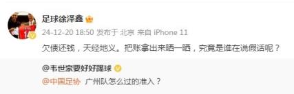 媒體人“足球徐澤鑫”寫道:“欠債還錢,天經(jīng)地義。把賬拿出來曬一曬,究竟是誰在說假話呢?”